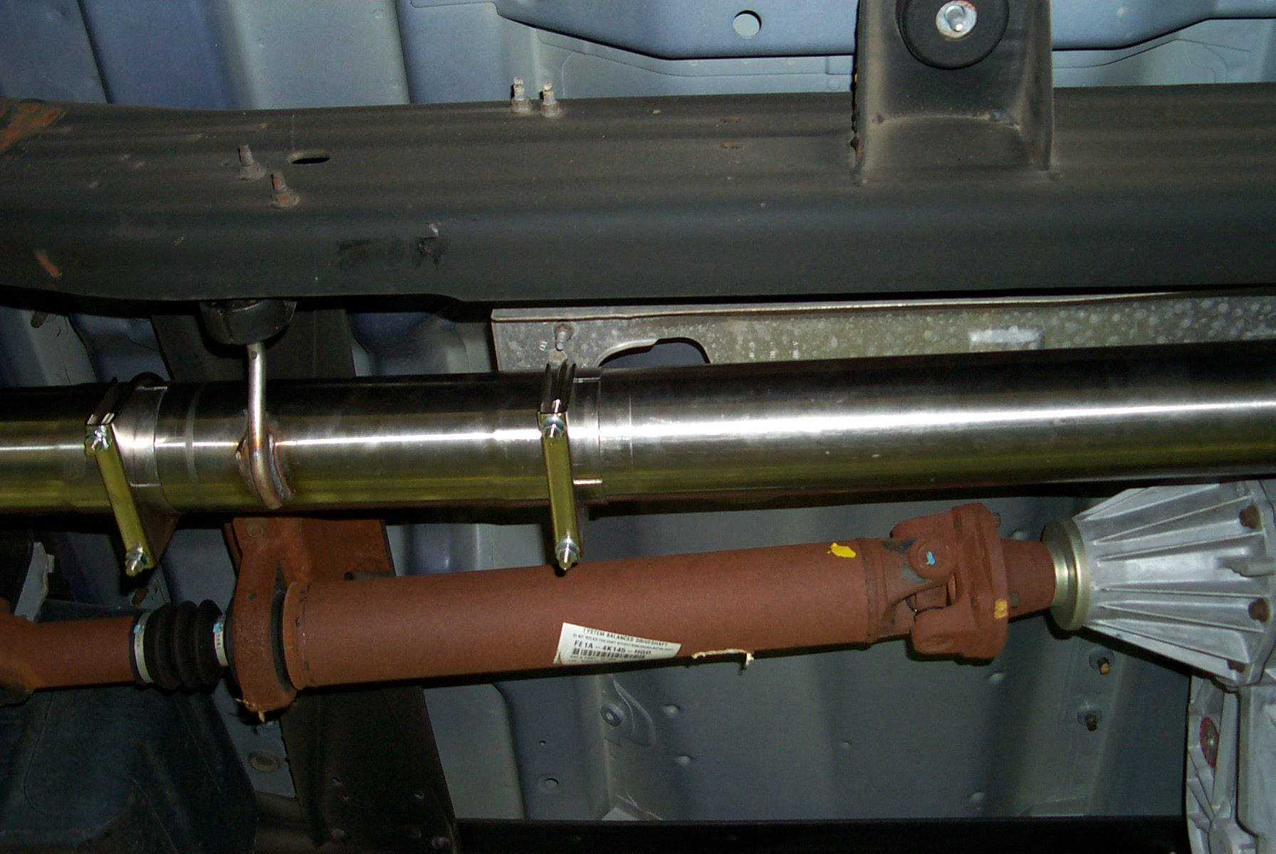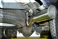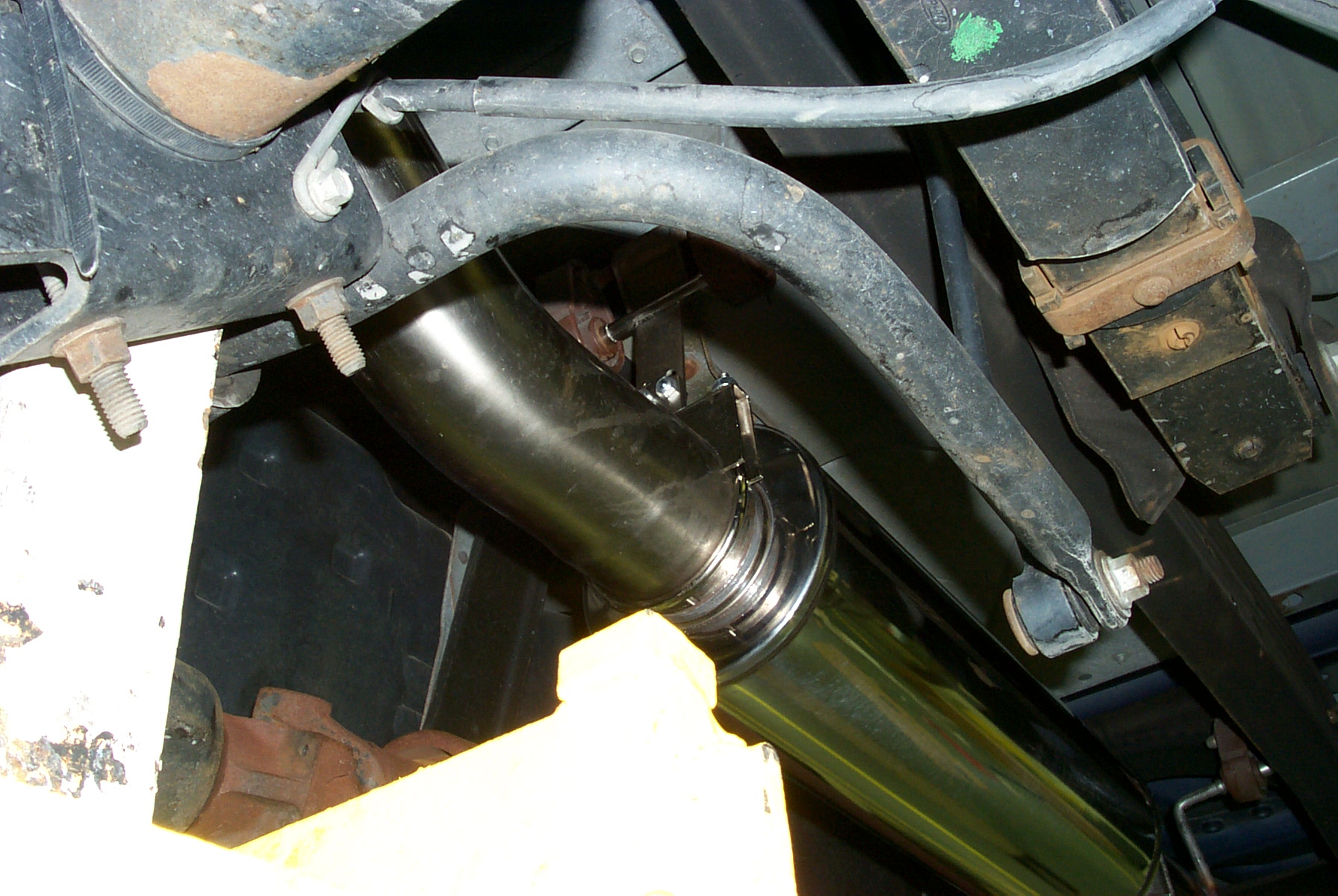 This shows most of the first and longest intermediate pipes (there are three).  The original exhaust had flanges and bolted together above the transmission skid plate.  I cut the original down pipe at the bend so I would not have to remove the transmission support and support the weight of the transmission.  The replacement pipes are designed to be installed without removing the transmission support.