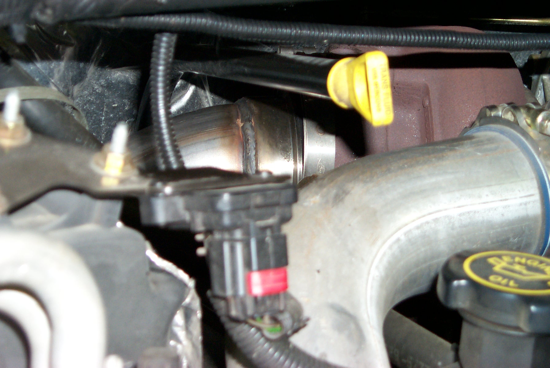 to the right of the black transmission dipstick tube. |